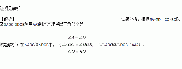 如图,已知∠A=∠D,CO=BO,求证:△AOC≌△DOB.