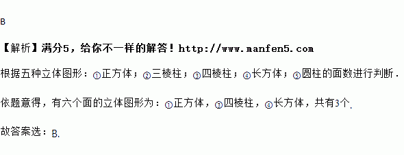 有以下五种立体图形:①正方体;②三棱柱;③四棱柱;④长方体;⑤圆柱.其中有六个面的立体图形是( )