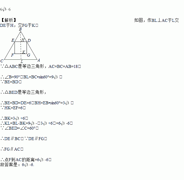 △ABC是边长为18的正三角形,点D、E分别在边AB、BC上,且BD=BE.若四边形DEFG是边长为6的正方形时,则点F到AC的距离等于__________.