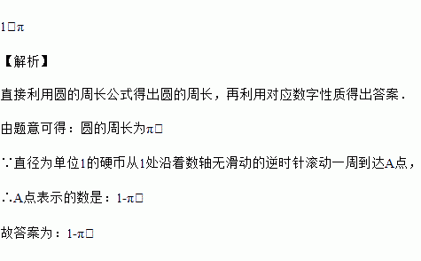 如图所示,直径为单位1的硬币从1处沿着数轴无滑动的逆时针滚动一周到达A点,则A点表示的数是_____.