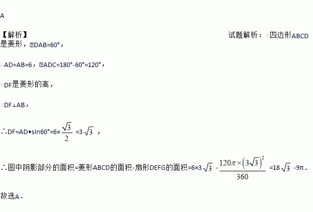 如图,在边长为6的菱形ABCD中,∠DAB=60°,以点D为圆心,菱形的高DF为半径画弧,交AD于点E,交CD于点G,则图中阴影部分的面积是( )