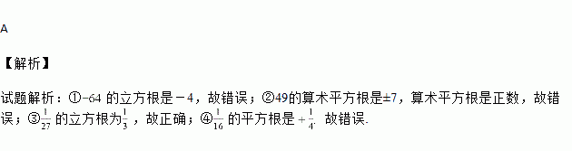 下列说法:①-64的立方根是4,②49的算数平方根是±7,③