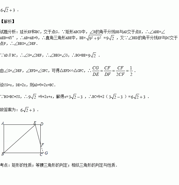 在矩形ABCD中,∠B的角平分线BE与AD交于点E,∠BED的角平分线EF与DC交于点F,若AB=9,DF=2FC,则BC= .(结果保留根号)