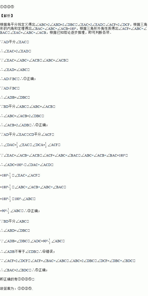 如图,∠ABC=∠ACB,AD、BD、CD分别平分∠EAC、∠ABC、∠ACF,以下结论:①AD∥BC;②∠ACB=2∠ADB;③∠ADC=90°-∠ABD;④BD平分∠ADC;⑤∠BDC=∠BAC,其中正确的结论有______ (填序号)