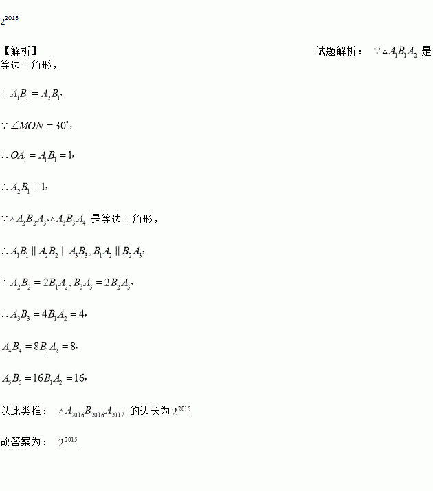 如图,已知∠MON=30°,点A1、A2、A3,…在射线ON上,点B1、B2、B3…在射线OM上,△A1B1A2、△A2B2A3、△A3B3A4 …均为等边三角形,若OA1=1,则△A2016B2016A2017的边长为_____.