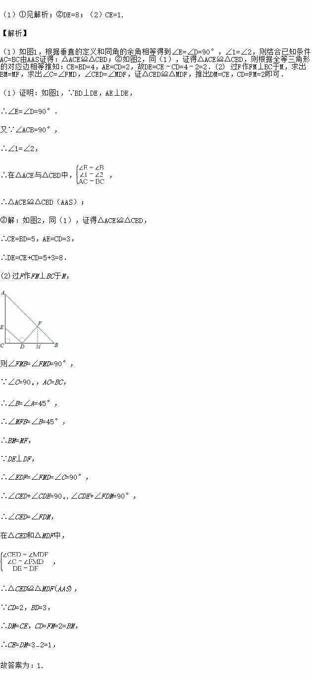 (1)①请你证明:△ACE≌△CBD;②若AE=3,BD=5,求DE的长;