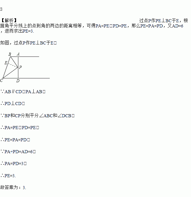 如图,AB∥CD,BP和CP分别平分∠ABC和∠DCB,AD过点P,且与AB垂直.若AD=6,则点P到BC的距离是_______.