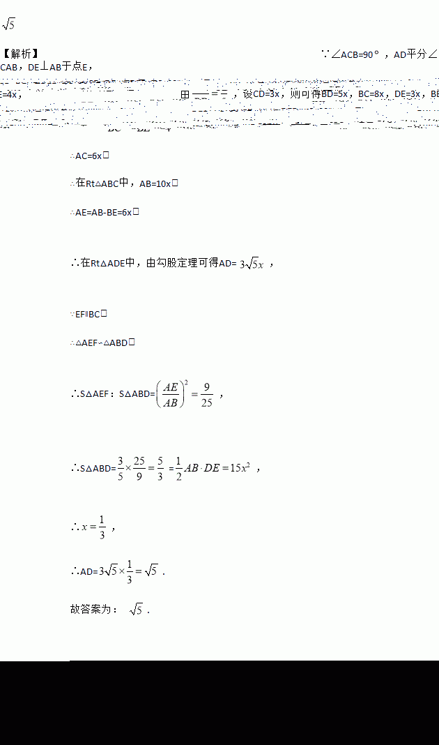 如图,在△ABC中,∠ACB=90,AD平分∠CAB,交BC边于点D,DE⊥AB于点E,EF∥BC交线段AD于点F,若, ,则线段AD的长为______.
