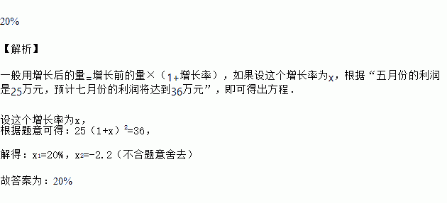 某企业五月份的利润是25万元,预计七月份利润将增加11万元,则六、七月份的平均增长率是_______.