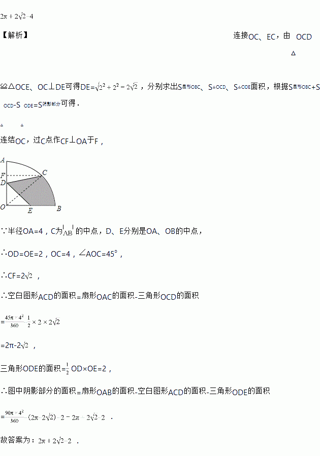 如图,在圆心角为90°的扇形OAB中,半径OA=4cm,C为弧AB的中点,D是OA的中点,则图中阴影部分的面积为________cm2.