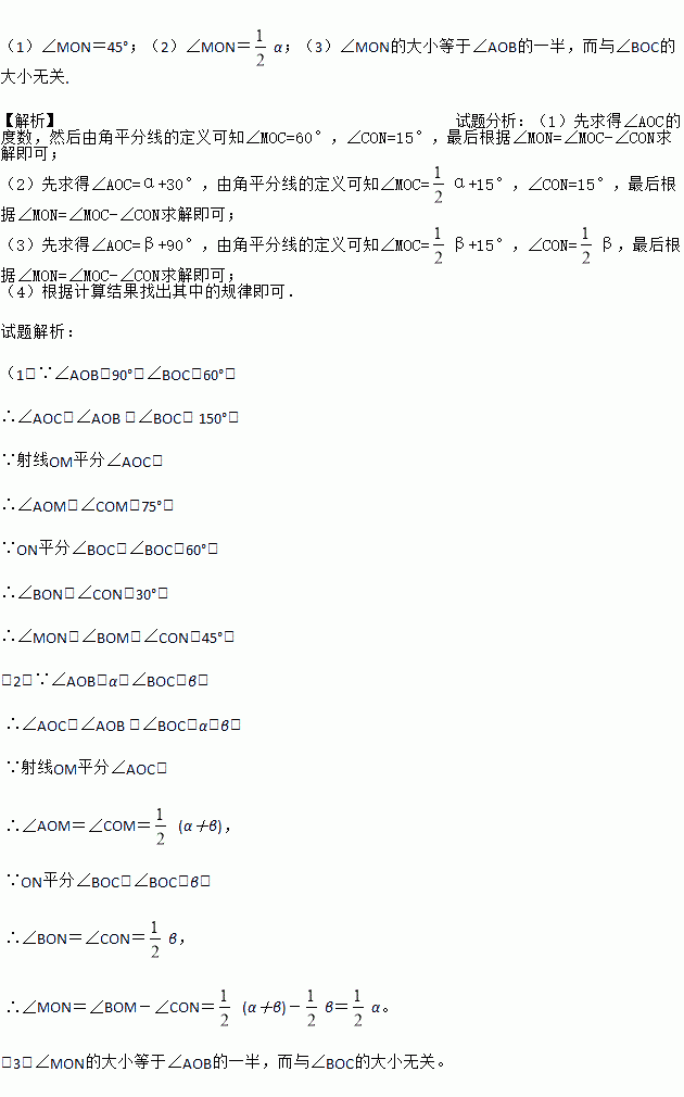 (2)如果(1)中,∠AOB=α,∠BOC=β(β为锐角),其他条件不变,求∠MON的度数;