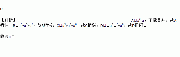 A. a2﹣a=a B. a2•a3=a6 C. a9÷a3=a3 D. (a3)2=a6