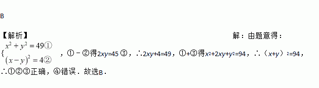如图是用4个全等的直角三角形与1个小正方形镶嵌而成的正方形图案,已知大正方形的面积为49,小正方形的面积为4.若用x,y表示直角三角形的两直角边长(x>y),下列四个说法:①x2+y2=49;②x-y=2;③2xy+4=49;④x+y=9.其中正确的说法是( )