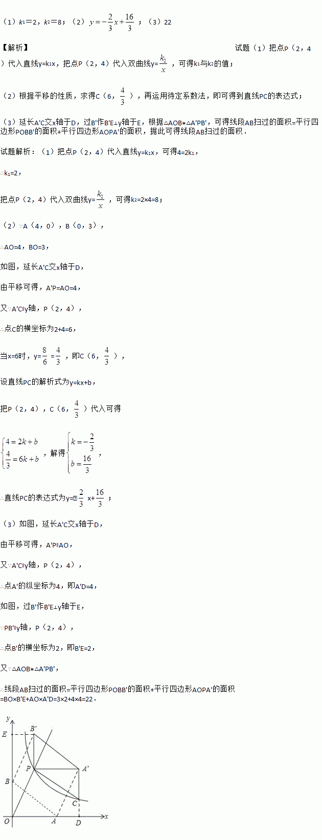 (x>0)相交于点P(2,4).已知点A(4,0),B(0,3),连接AB,将Rt△AOB沿OP方向平移,使点O移动到点P,得到△A′PB′.过点A′作A′C∥y轴交双曲线于点C,连接CP.