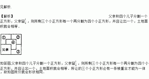 一位父亲有一块正方形的土地,他把其中的留给自己,其余的平均分给他的四个儿子,如下图所示,他想使每个儿子获得的土地面积相等,形状相同,这位父亲应该怎么分?试画出示意图,并加以说明.