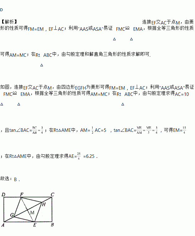如图,矩形ABCD中,AB=8,BC=6.点E在边AB上,点F在边CD上,点G、H在对角线AC上.若四边形EGFH是菱形,则AE的长是( )