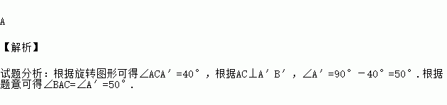 如图,将△ABC绕点C顺时针方向旋转40°,得△A′CB′,若AC⊥A′B′,则∠BAC等于( )