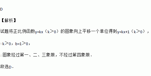 在平面直角坐标系中,将正比例函数y=kx(k>0)的图象向上平移一个单位,那么平移后的图象不经过( )