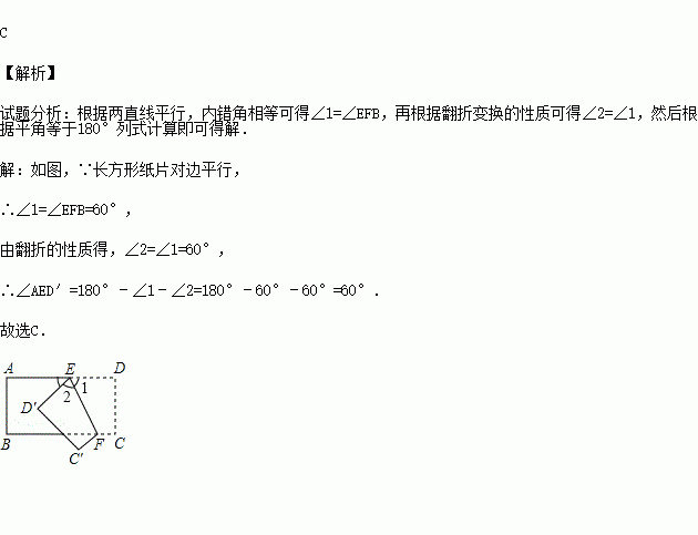 如图把一个长方形纸片沿EF折叠后,点D、C分别落在D′、C′位置,若∠EFB=60°,则∠AED′=( )
