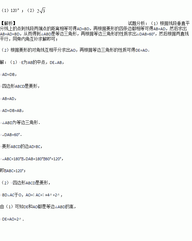如图,在菱形ABCD中,AC,BD相交于点O,E为AB的中点,DE⊥AB.