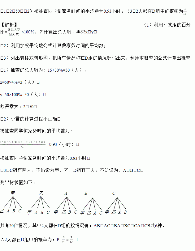 (2)小君计算被抽查同学做家务时间的平均数是这样的: