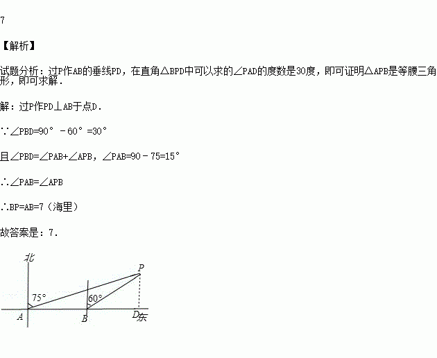 某轮船由西向东航行,在A处测得小岛P的方位是北偏东75°,又继续航行7海里后,在B处测得小岛P的方位是北偏东60°,则此时轮船与小岛P的距离BP= 海里.