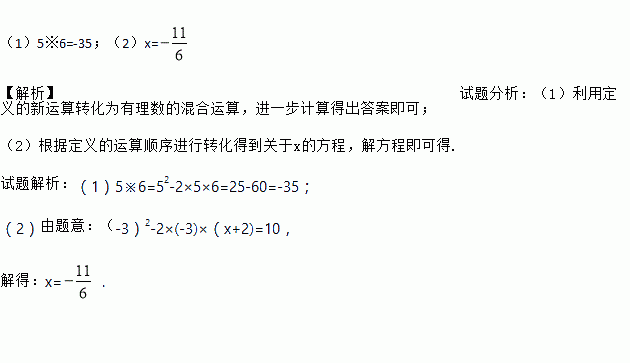 (1)5※6=-35;(2)x= 【解析】试题分析:(1)利用定义的新运算转化为有理数的混合运算,进一步计算得出答案即可; (2)根据定义的运算顺序进行转化得到关于x的方程,解方程即可得. 试题解析:(1)5※6=52-2×5×6=25-60=-35; (2)由题意:(-3)2-2×(-3)×(x+2)=10, 解得:x= .