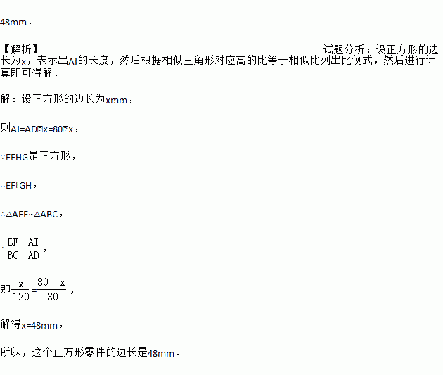 如图,△ABC是一块锐角三角形的材料,边BC=120mm,高AD=80mm,要把它加工成正方形零件,使正方形的一边在BC上,其余两个顶点分别在AB、AC上,这个正方形零件的边长是多少mm.