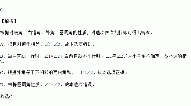 下列图形中,∠1一定大于∠2的是( )