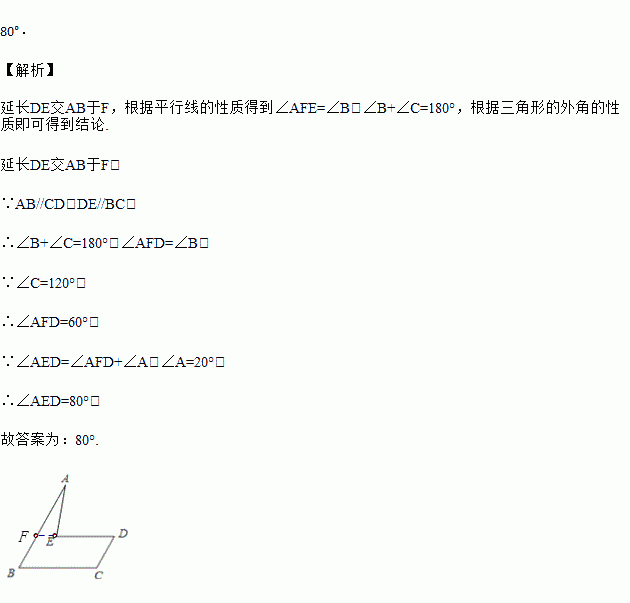 如图,已知AB∥CD,BC∥DE.若∠A=20°,∠C=120°,则∠AED的度数是________ .