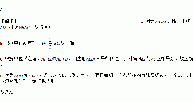 A 【解析】A. 因为AB>AC,所以中线AD不平分∠BAC,故错误; B. 根据中位线定理,EF=BC.故正确; C. 根据中位线定理,AF∥ED,AE∥FD,四边形AEDF为平行四边形,对角线EF与AD互相平分。故正确; D. 因为△DFE和△ABC的各边对应成比例,为1:2,而且每组对应点所在的直线都经过同一个点,对应边互相平行,是位似图形。 故选A.