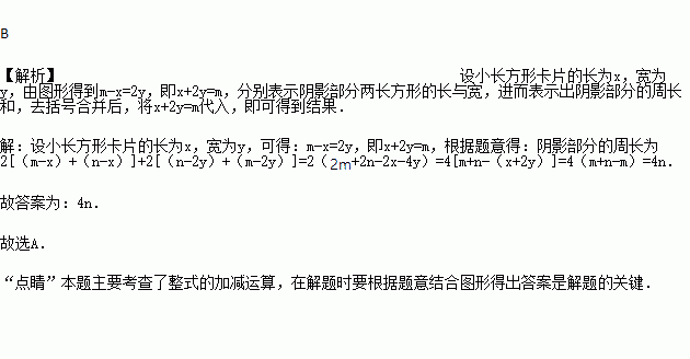 把四张形状大小完全相同的小长方形卡片(如图①)不重叠地放在一个底面为长方形(长为m cm,宽为n cm)的盒子底部(如图②),盒子底面未被卡片覆盖的部分用阴影表示.则图②中两块阴影部分的周长和是( )
