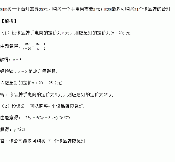 (2)经商谈,商店给予荣庆公司购买一个该品牌台灯赠送一个该品牌手电筒的优惠,如果荣庆公司需要手电筒的个数是台灯个数的2倍还多8个,且该公司购买台灯和手电筒的总费用不超过670元,那么荣庆公司最多可购买多少个该品牌台灯?