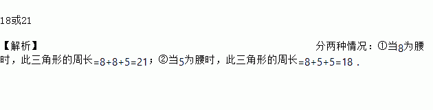 等腰三角形一边等于5,另一边等于8,则其周长是_________.