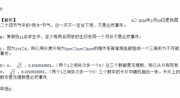 A. 2018年2月19日是我国二十四节气中的“雨水”节气,这一天会下雨