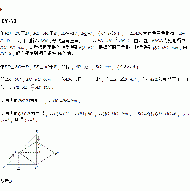 cm的速度向终点B运动;同时,动点Q从点B出发沿BC方向以每秒1cm 的速度向终点C运动,将△PQC沿BC翻折,点P的对应点为点P′.设Q点运动的时间 t 秒,若四边形QPCP′为菱形,则 t 的值为( )