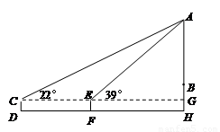 结合中外多种艺术风格的“八卦楼”建立在一座平台上,为了测量“八卦楼”的高度AB,小华在D处用高1.1米的测角仪CD,测得楼的顶端A的仰角为22°;再向前走63米到达F处,又测得楼的顶端A的仰角为39°(如图是他设计的平面示意图).已知平台的高度BH约为13米,请你求出“八卦楼”的高度约多少米?