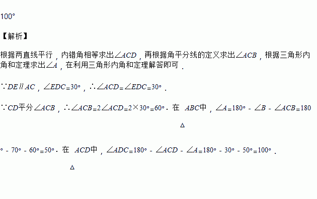 如图,在△ABC中,CD平分∠ACB,DE∥AC,∠B=70°,∠EDC=30°,求∠ADC的度数.