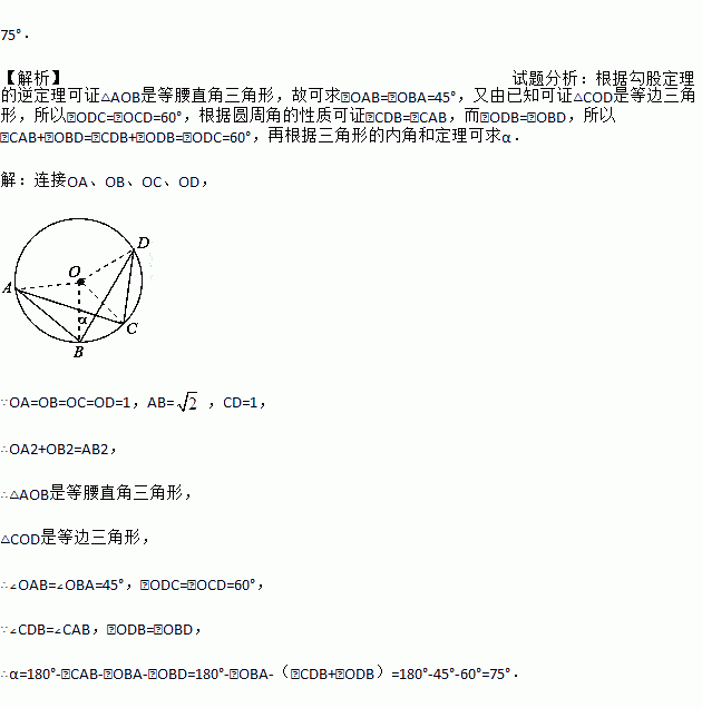 如图⊙O的半径为1cm,弦AB、CD的长度分别为,则弦AC、BD所夹的锐角= .