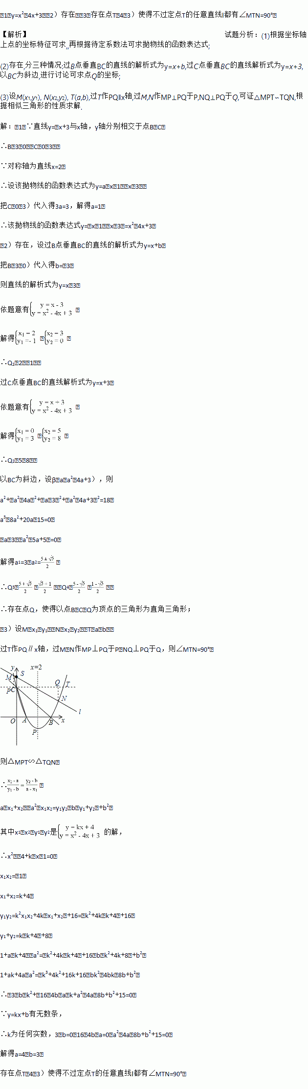 (3)过S(0,4)的动直线l交抛物线于M,N两点,试问抛物线上是否存在定点T,使得不过定点T的任意直线l都有∠MTN=90°?若存在,请求出点T的坐标;若不存在,请说明理由.