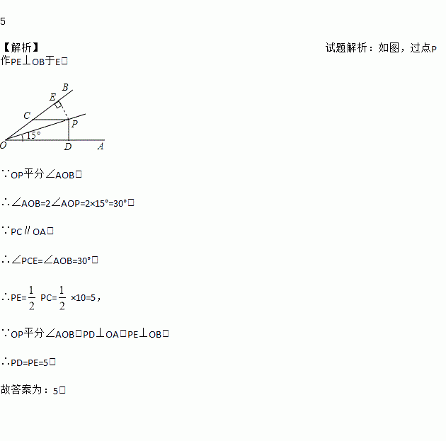 如图,OP平分∠AOB,∠AOP=15º,PC∥OA,PD⊥OA于D,PC=10,则PD=_________.
