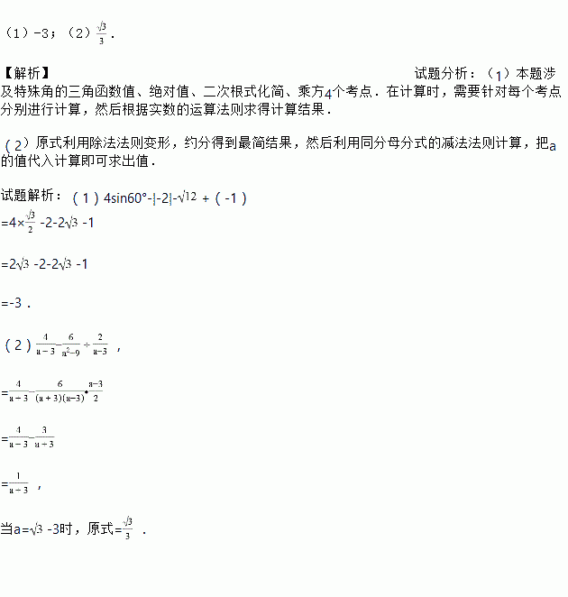 (1)计算:4sin60°﹣|﹣2|﹣+(﹣1)2017.