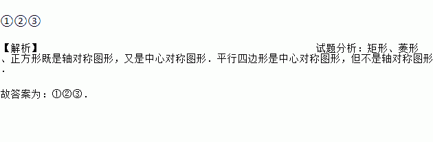 ①②③ 【解析】试题分析:矩形、菱形、正方形既是轴对称图形,又是中心对称图形.平行四边形是中心对称图形,但不是轴对称图形. 故答案为:①②③.