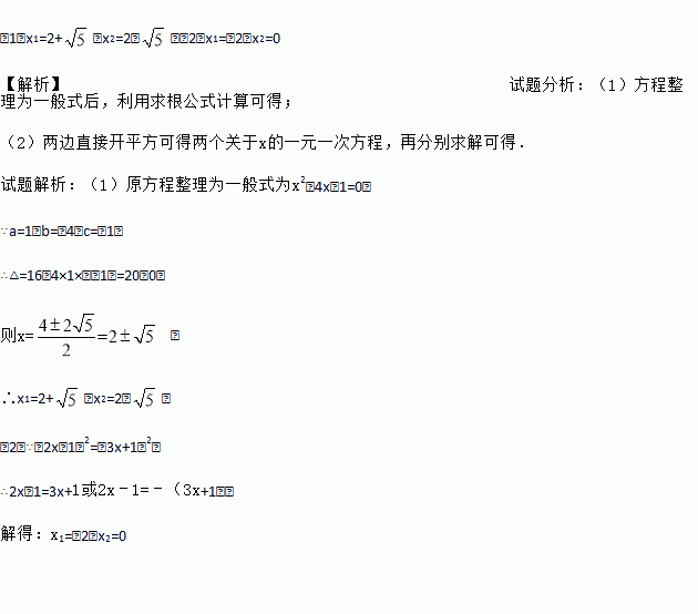 (1)x1=2+、x2=2﹣;(2)x1=﹣2、x2=0 【解析】试题分析:(1)方程整理为一般式后,利用求根公式计算可得; (2)两边直接开平方可得两个关于x的一元一次方程,再分别求解可得. 试题解析:(1)原方程整理为一般式为x2﹣4x﹣1=0, ∵a=1、b=﹣4、c=﹣1, ∴△=16﹣4×1×(﹣1)=20>0, 则x= , ∴x1=2+、x2=...