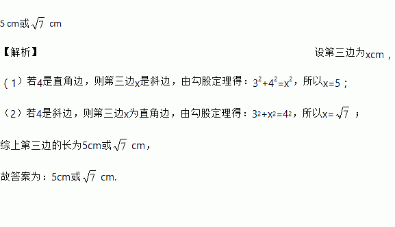 5 cm或cm 【解析】设第三边为xcm, (1)若4是直角边,则第三边x是斜边,由勾股定理得:32+42=x2,所以x=5; (2)若4是斜边,则第三边x为直角边,由勾股定理得:32+x2=42,所以x=; 综上第三边的长为5cm或cm, 故答案为:5cm或cm.