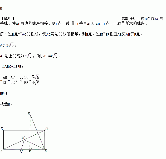 如图,在矩形ABCD中,AB=10,BC=5.若点M、N分别是线段AC,AB上的两个动点,则BM+MN的最小值为( )