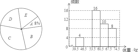 某校为了了解初三年级1000名学生的身体健康情况,从该年级随机抽取了若干名学生,将他们按体重(均为整数,单位:kg)分成五组(A:39.5~46.5;B:46.5~53.5;C:53.5~60.5;D:60.5~67.5;E:67.5~74.5),并依据统计数据绘制了如下两幅尚不完整的统计图.