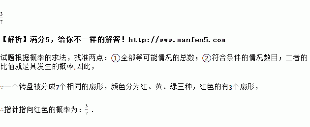 如图,一个转盘被分成7个相同的扇形,颜色分为红、黄、绿三种,指针的位置固定,转动转盘后任其自由停止,其中时某个扇形会恰好停在指针所指的位置(指针指向两个扇形的交线时,当作指向右边的扇形),则指针指向红色的概率为___________.