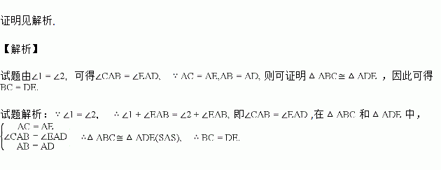 如图所示,AC=AE,∠1=∠2,AB=AD.求证:BC=DE.