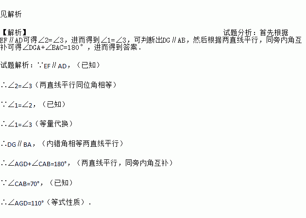 如图,已知点D、F、E、G都在△ABC的边上,EF∥AD,∠1=∠2,∠BAC=70°,求∠AGD的度数.(请在下面的空格处填写理由或数学式)